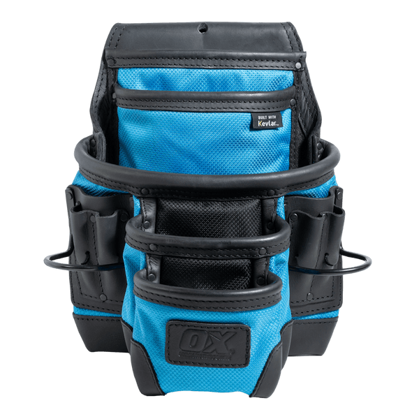 Built with the tradesman in mind, the OX Ultimate 10-Pocket Leather & Nylon Dual Hammer Holder Fastener Pouch is tough, dependable, and comfortable. It is constructed from a combination of 1680D ballistic nylon and top-grain leather with PVC coating. Kevlar® is a key component of the pouch. The pouch includes Kevlar® reinforced double row stitching as well as a Kevlar® reinforced pouch bottom. This Kevlar® design allows this pouch to handle the rigors of any jobsite. For more durability assurance the pouch is also equipped with hooks and rivets made from iron and electrophoretic coating. The pouch is also water and UV resistant, keeping it cooler and lighter during harsh weather conditions. The pouch includes thick tubing around its edges allowing it to maintain its original shape even after long term use. Overall, this fastener pouch is made durable and is meant to assist all professional tradesman.