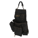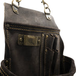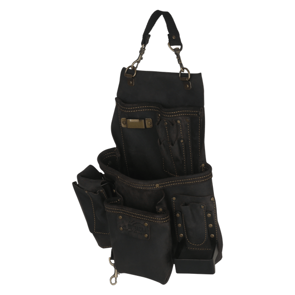 Built with the tradesman in mind, The OX Pro Oil Tanned 14 Pocket Top Grain Leather Pouch with Air Gun holder is designed to be a versatile platform for a variety of trades that use power tools daily. Constructed from high quality top grain oil tanned leather to ensure the pouch will stand up to abrasion, scratches, or tearing. Each pocket is reinforced with coated iron rivets and double row stitching, making the pouch resistant to common damage of long term jobsite use. The pouch has three main pockets for chalk reels, fasteners, screw drivers, pliers, pencils, pens, speed squares, torpedo levels and more. Secondary pockets line the pouch with holders for claw bars, pencils, pens, screw drivers, pliers and other small tools. The pouch also includes 3 dedicated holsters for your hammer, air gun/power tool, and a tape measure clip; as well as a loop for attaching a roll of tape. Fits 2 inch and 3 inch tool belts and comes with a detachable handle for easy mobility.